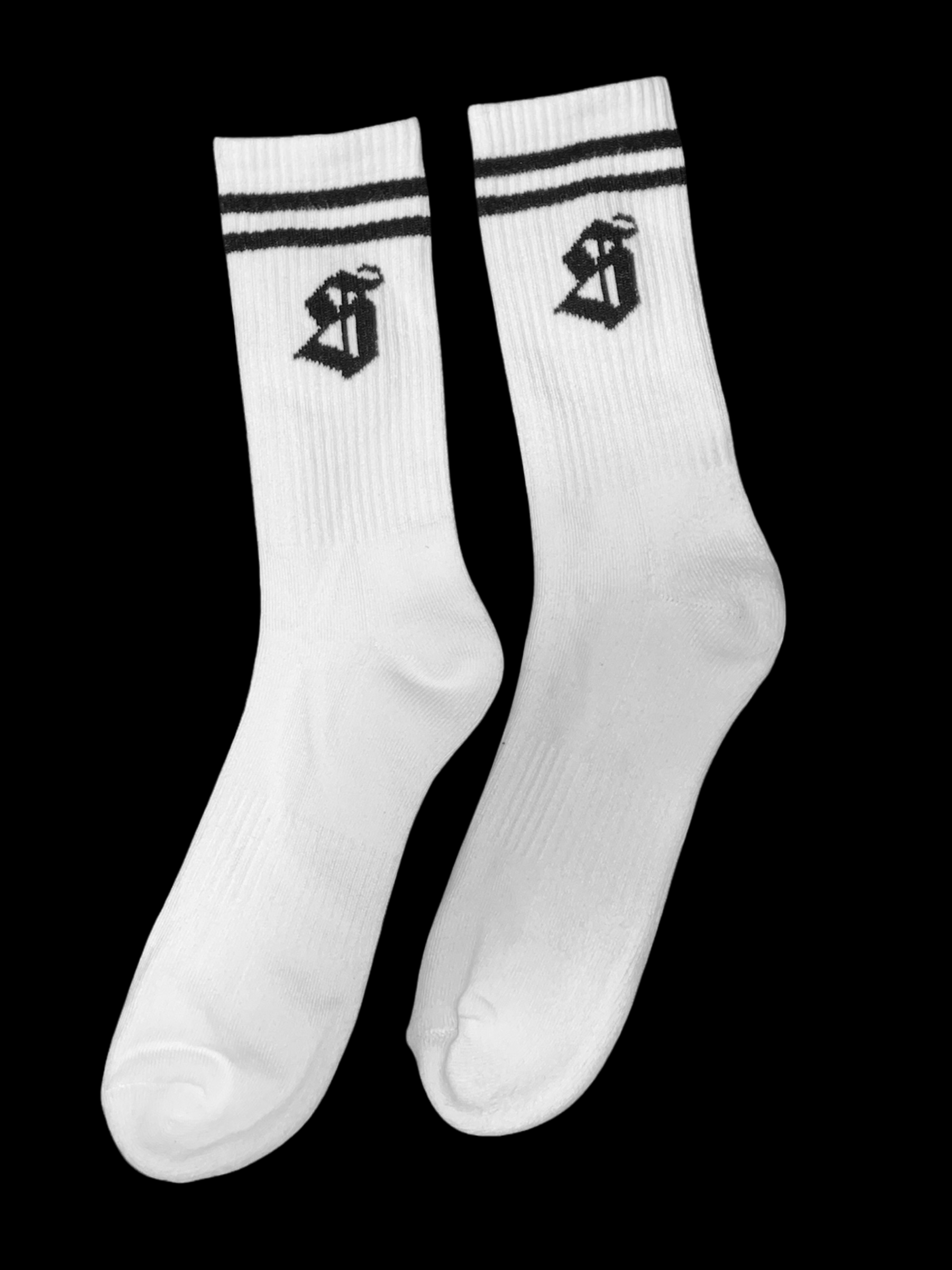 White ribbed cotton blend athletic socks with black double stripe detail. Mid-calf length. Woven Synagi “S” emblem at side.